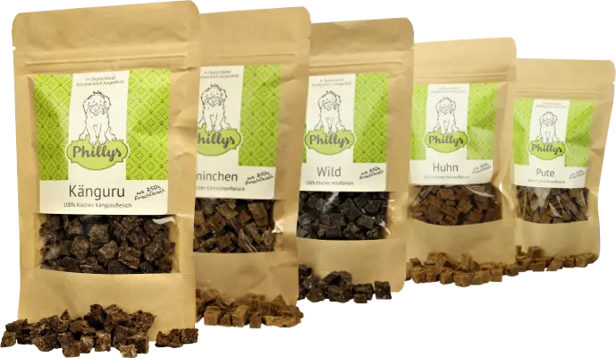 Phillys Fleisch-Minis gibt es jetzt auch in den Sorten Kaninchen, Känguru, Wild, Huhn und Pute. Die Minis sind mit einem 5x5x8 mm-Format Kleinhund-tauglich (auch für Chihuahua), bestehen aus Fleisch pur (frisch verarbeitetes Muskelfleisch bedeutet 100g Leckerli aus 250g Frischfleisch) ohne jegliche Farb-, Aroma-, Zusatz- und Hilfsstoffe, sind auch frei von nicht einzeln deklarierungspflichtigen "Mineralstoffen", werden vitaminerhaltend schonend gebacken und sind bestens geeignet für das Training, wenn viele kleine Belohnungen gefragt sind.
