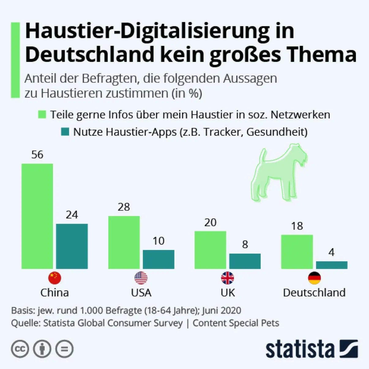 Der deutsche Haustierbesitzer bleibt, gemäß der Studie, auch im Jahr 2020 offline – im Gegensatz zum digitalen Vorreiter China. 42 Prozent der chinesischen Heimtierbesitzer würden lieber online als offline für ihre Gefährten einkaufen. Nur ein Viertel der deutschen Befragten kaufe hingegen eher online ein. Die digitalen Vorzüge des Smartphones werden in der Volksrepublik ebenfalls ausführlich für die Heimtiere genutzt: In China habe fast jeder Vierte themenverbundene Apps wie Gesundheitstracker auf seinem Handy. 56 Prozent der Haustierbesitzer teilten mit ihrer Social-Media-Community Informationen zu ihrem Tier. In Deutschland, hat Statista festgestellt, geht es diskreter zu: Nicht einmal jeder Fünfte informiert in Sozialen Medien über sein Heimtier. Themenverbundene Heimtier-Apps nutzten gerade einmal vier Prozent. Die primäre Informationsquelle für Heimtierbedürfnisse bleibt der Tierarzt, geben 44 Prozent der deutschen Tierbesitzer an.