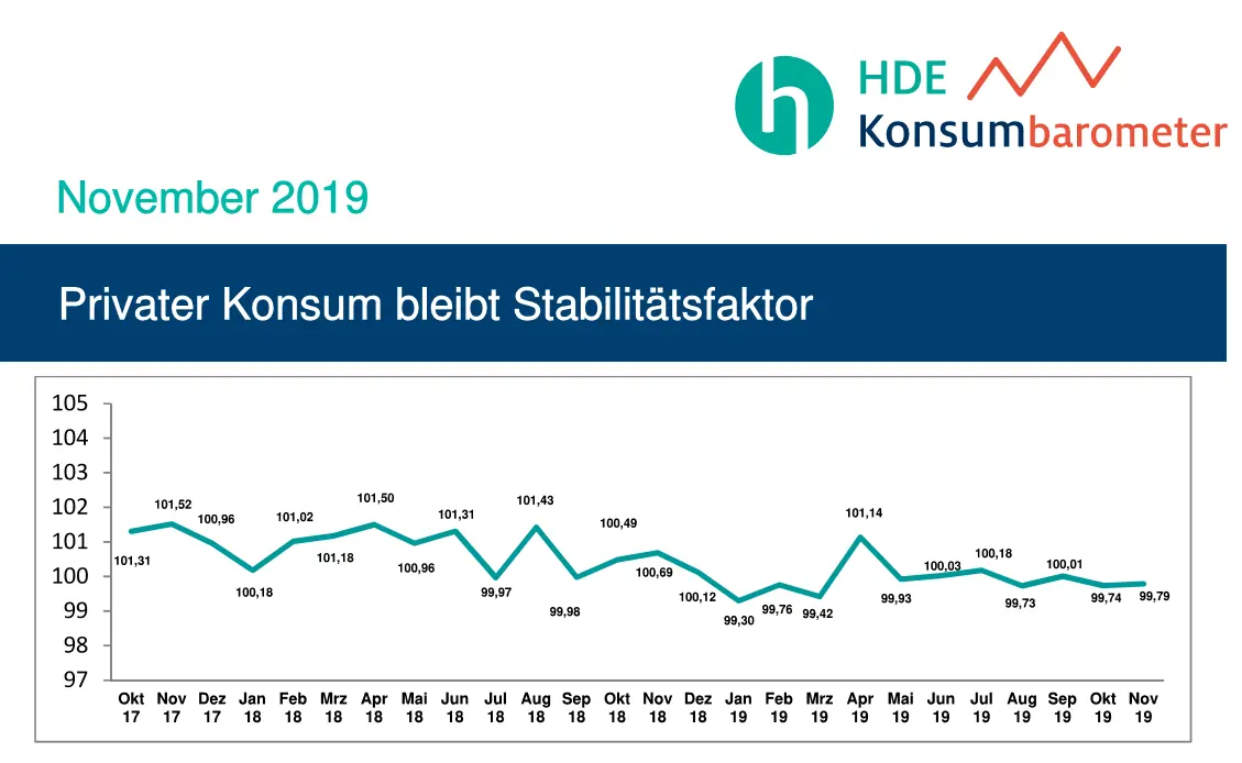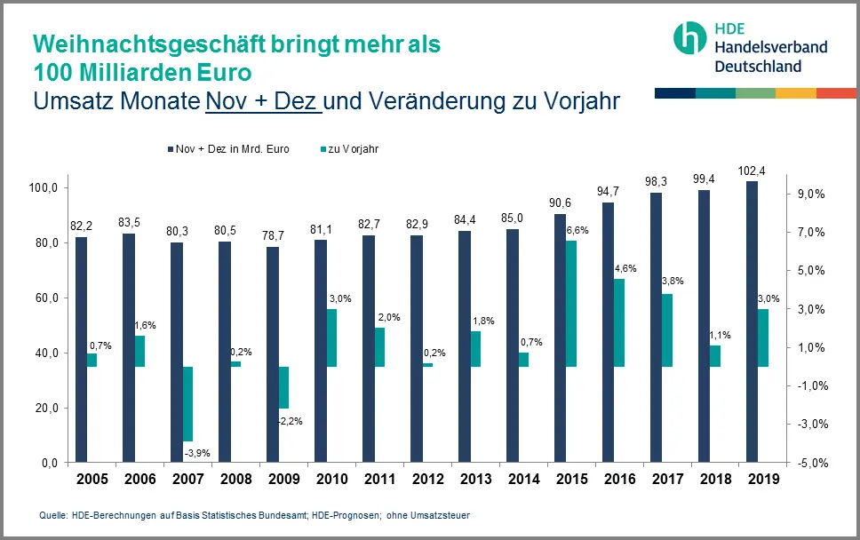 Der Handelsverband Deutschland (HDE) hebt seine Jahresprognose für 2019 auf +3,2 Prozent an. Grund ist die anhaltend stabile Verbraucherstimmung. Im bevorstehenden Weihnachtsgeschäft rechnet der HDE mit einem Umsatzplus von 3 Prozent im Vergleich zum Vorjahr.