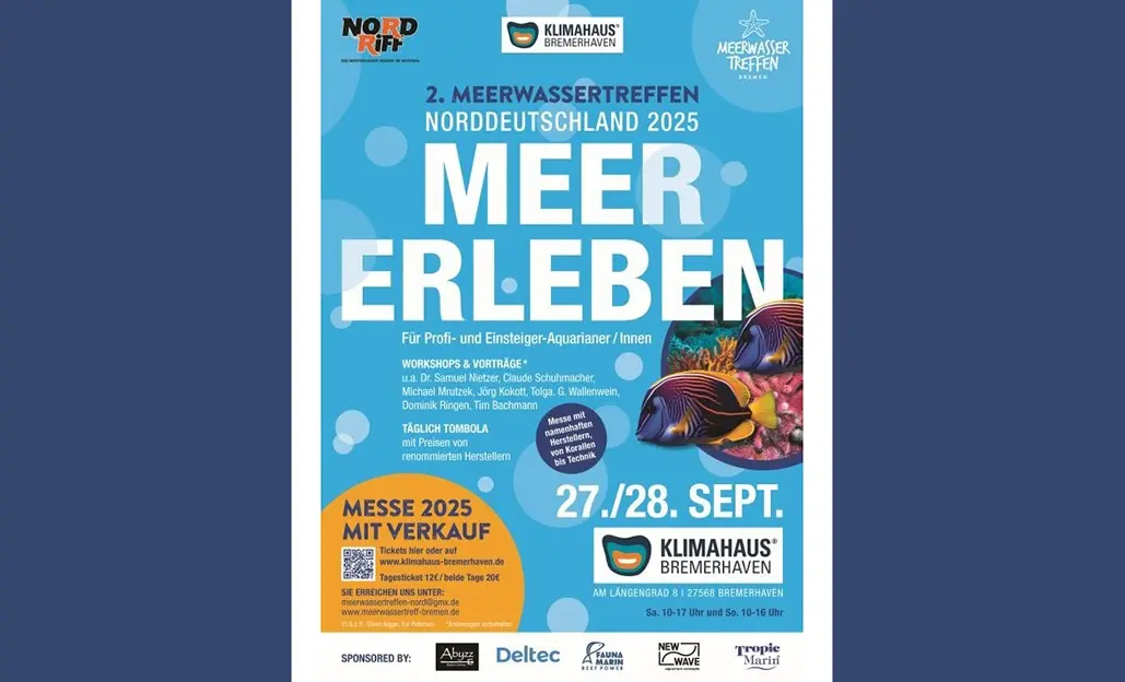 Zu einem Erfahrungsaustausch von Profis und Einsteigern mit Fachvorträgen und der Messe „Nordriff“ lädt das zweite Meerwassertreffen Norddeutschland für den 27. und 28. September erstmalig ins Klimahaus Bremerhaven ein. Eingeladen sind alle, die sich für Trends und Neuheiten in der Meerwasseraquaristik interessieren.