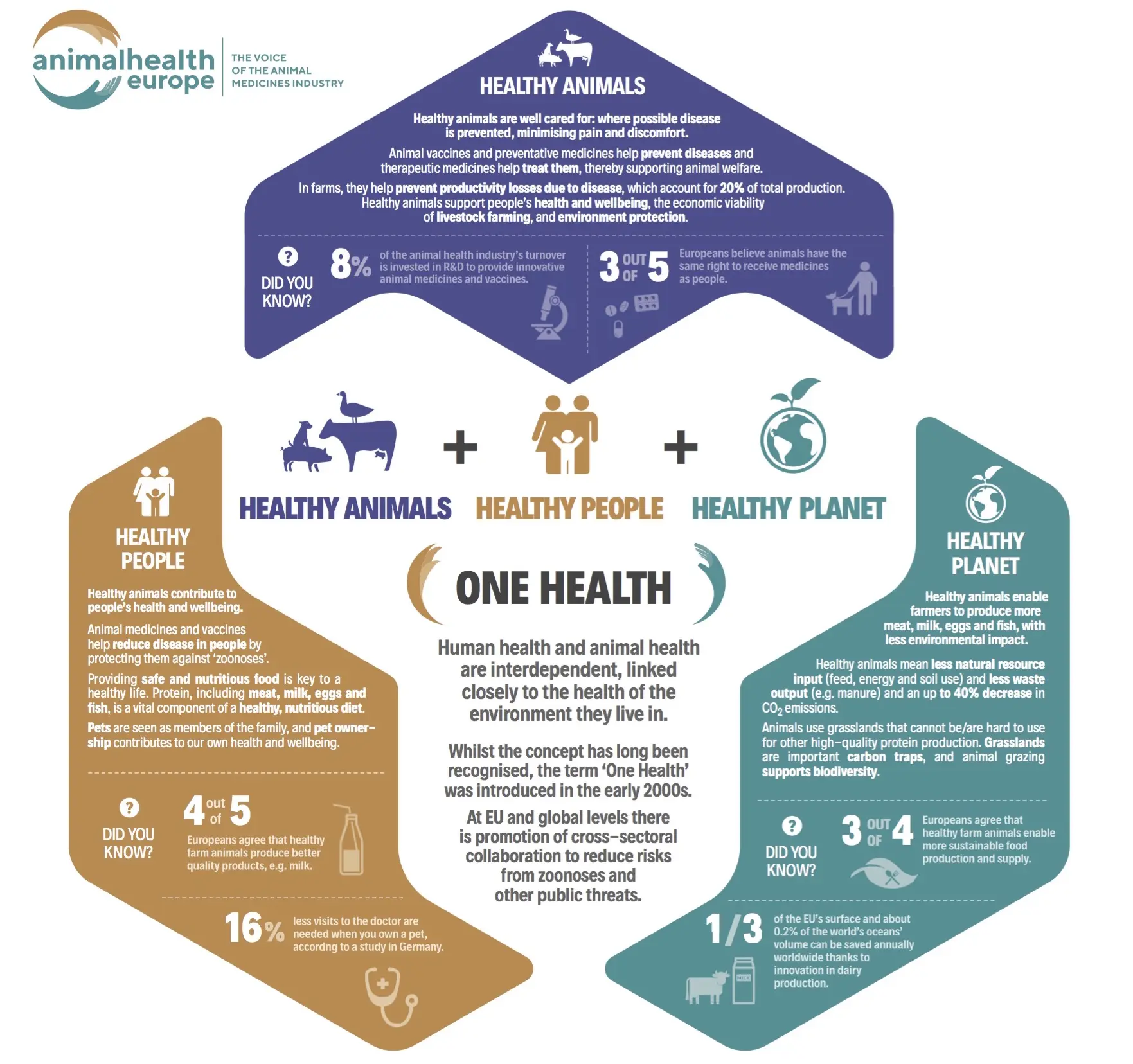 Ziel der diesjährigen AnimalhealthEurope-Jahreskonferenz war, zu erkunden, womit der „One Health“-Gedanke realisiert werden kann. Als zentrale Plattform für die Tierarzneimittelindustrie stellt der „One Health“-Ansatz die Lebensqualität von Mensch und Tier in den Vordergrund. Grundlegende Annahme ist, dass gesündere Tiere zur Gesundheit des Menschen und zu einem intakten Planeten beitragen.