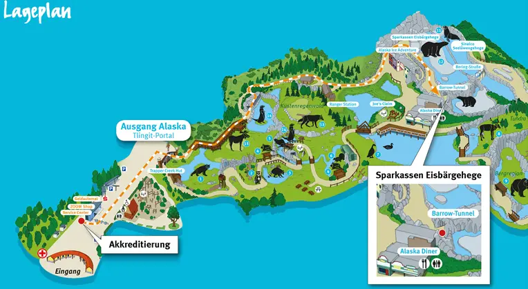 Nach einem in Europa einzigartigen Zoo-Konzept leben die Tiere in einem natürlichen Lebensraum, in dem sie sich nahezu frei bewegen können. Neben den Eisbären und imposanten Braunbären erkunden u.a. Elche, Luchse und Wölfe ihre großzügigen Reviere. Besucher können die faszinierenden Bewohner Alaskas immer wieder aus nächster Nähe beobachten: Im Inneren der Bärenhöhle oder des verglasten Unterwassertunnels im Revier der Seelöwen tauchen sie mitten in die Welt der Tiere ein.